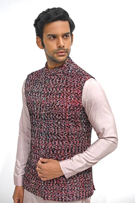 Pink bundi with textured detail & front button placket. Paired with kurta & churidar.