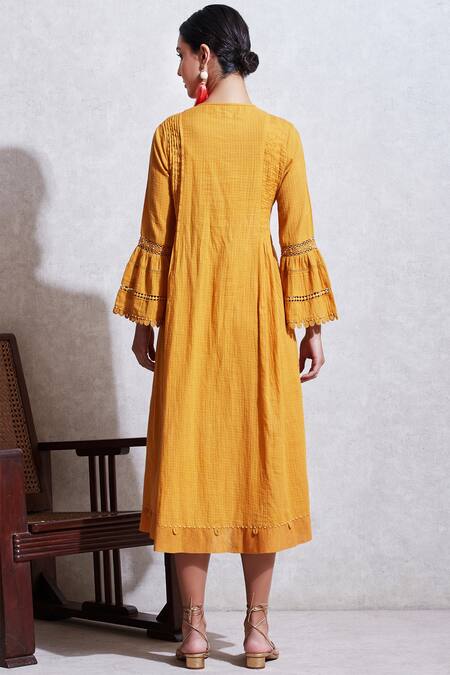 Mustard yellow flared kurta with all over checkered texture,placement embellishment & lace trim detail.