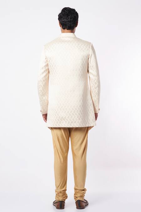 Cream textured nawabi sherwani. Paired with gold churidar.
