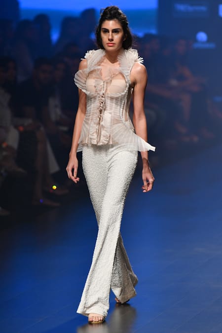 An ideal pick for the new-age modern-day princess is this beige-hued, textured overlay corset. Coordinated with sequin, pearl-white bell-bottoms this stunning pant-set ups the drama quotient.