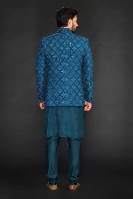 Teal green textured blazer with thread, sequin embroidery in geometric pattern. Paired with kurta & churidar.