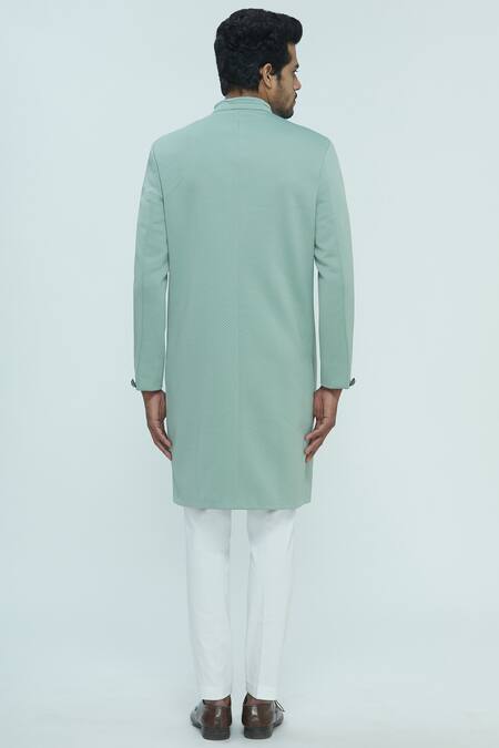 Blue textured straight sherwani with welt pocket. Comes with white trousers.