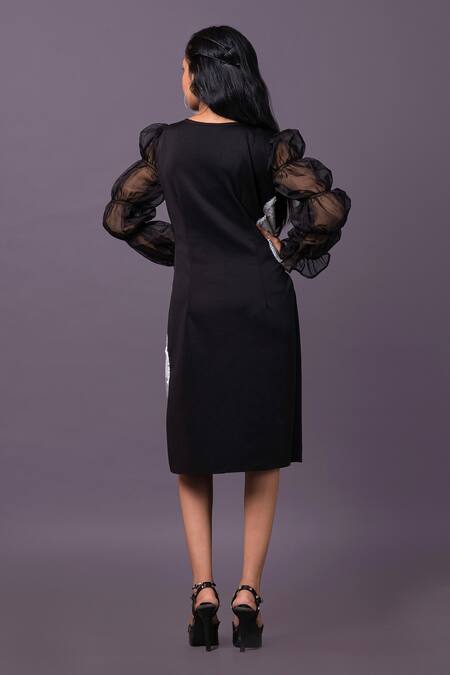 Black dress featuring V-neckline, bubble sleeves, and floral cutdana embroidery