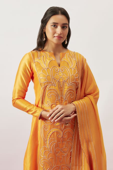 Orange straight kurta featuring floral embroidery with zari, dori, and applique work. Paired with a matching pant and dupatta with tassels.