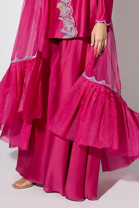 Pink kurta featuring floral embroidery with scallop detailing. Paired with a matching gharara and pleated dupatta.
