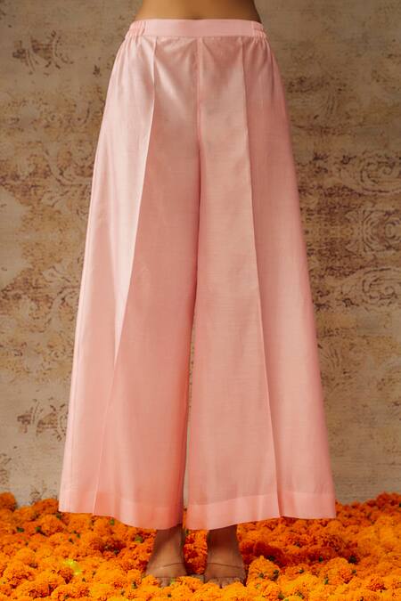 Peach Viscose, Chanderi Embroidery V-neck Floral Kurta Palazzo Set