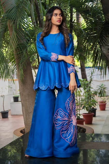 Buy_The Aarya_Blue Chanderi, Viscose, Organza Sequins, Handwoven Anarkali Gharara Set_at_Aza_Fashions