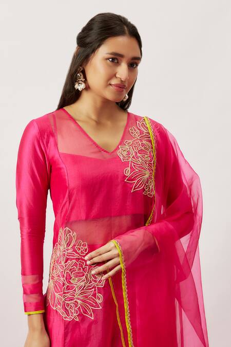 Pink Organza, Chanderi, Handloom Cotton Embroidery, Jazmin Hand Kurta Pant Set