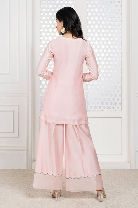 Peach kurta featuring hand embroidered neckline with zardosi, glass beads, and sequins. Paired with scalloped palazzo and a viscose organza dupatta.