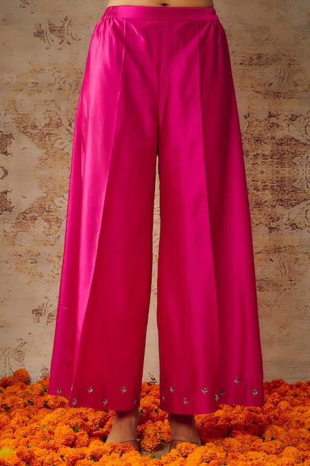 Pink kurta featuring a glass bead and sequin embroidered yoke. Paired with matching palazzo and scallop bordered dupatta.