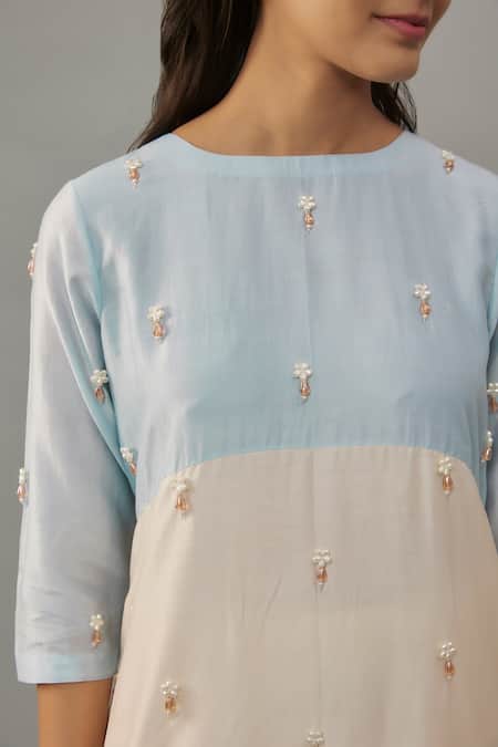 Ivory kurta featuring boat neck and three quarter sleeves with hand embroidery of pearls. Paired with a matching palazzo featuring an elasticated waistband.