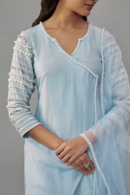 Powder blue kurta featuring hand embroidered pearls and a notched neckline. Paired with cigarette pants and a matching dupatta.