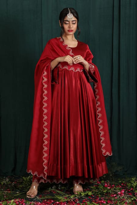 Ruby red anarkali featuring placement floral embroidery on cuffs in zari and badla. Paired with scallop trim, zari embroidered palazzo and dupatta.