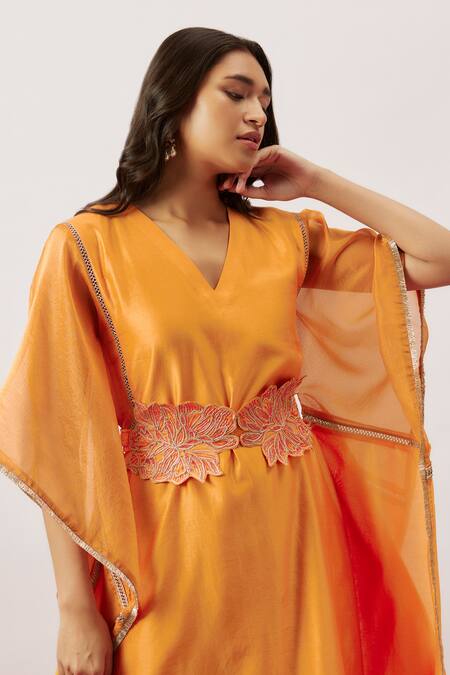 Orange Handloom Cotton, Chanderi, Organza Embroidery Sahana Panel Kaftan