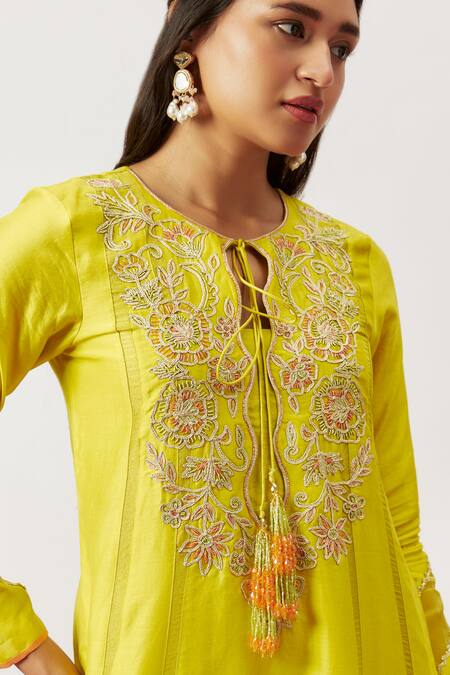 Lime green A-line kurta featuring round neckline and full sleeves with floral and zari hand embroidery. Paired with a matching cigarette pant and dupatta.