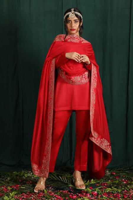 Red kurta in mashru silk featuring a round neckline and full sleeves. Paired with cigarette pants and an embroidered border dupatta.