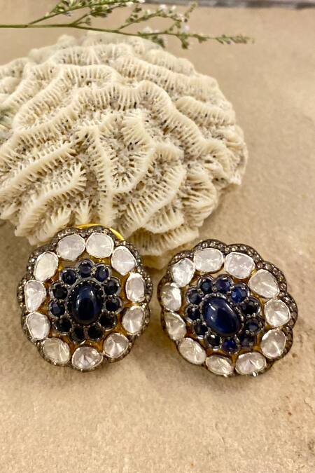 Silver stud earrings featuring a floral pattern with uncut and single cut diamonds, and sapphire embellishments