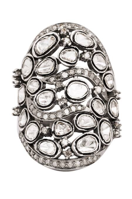 Silver ring featuring uncut, single cut, and rose cut diamond embellishments with a floral pattern