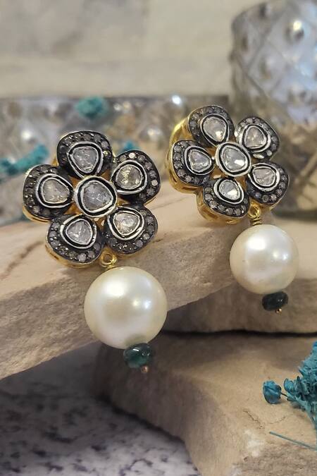 Silver earrings featuring uncut and single cut diamonds with pearl embellishments