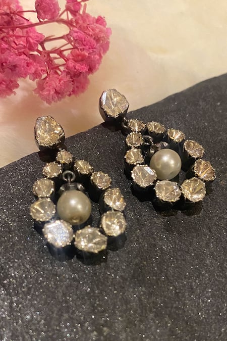 Black sterling silver dangler earrings featuring polki embellishment and a pearl drop