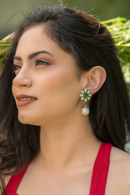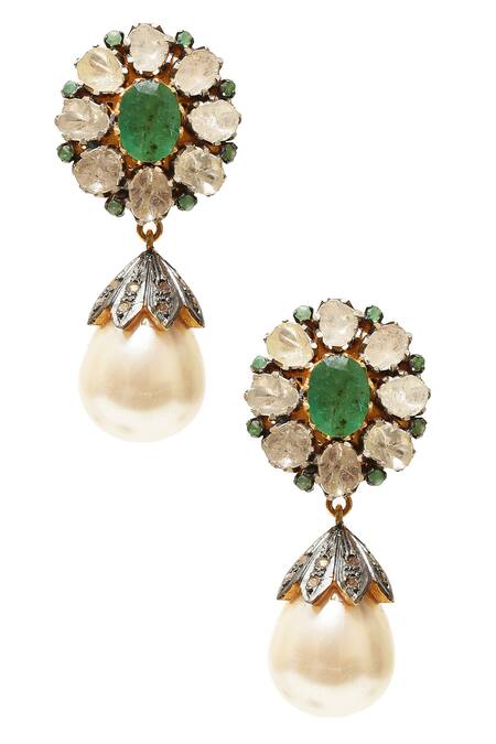 White and green earrings featuring a floral design with emerald stones and pearl drops