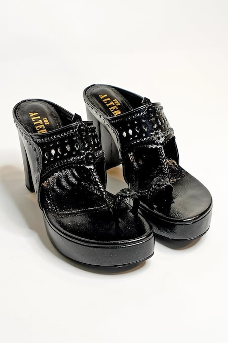 Black kolhapuri block heels featuring a braided and cutwork design with a toe ring