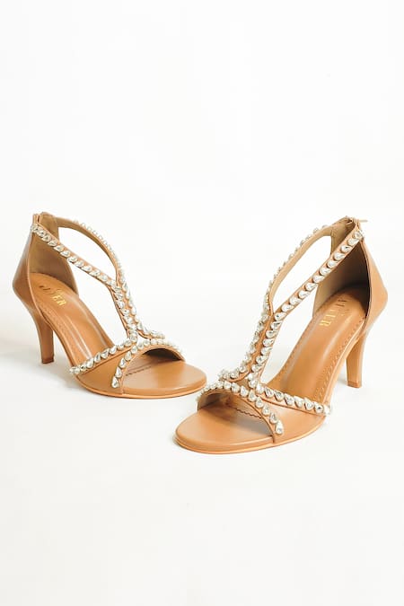 Brown rhinestone embellished stiletto heels featuring a zip counter