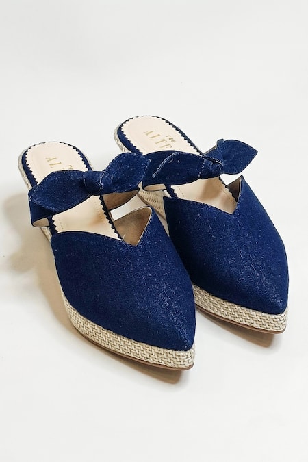 Denim blue pointed wedges featuring bow knot detailing and a 2