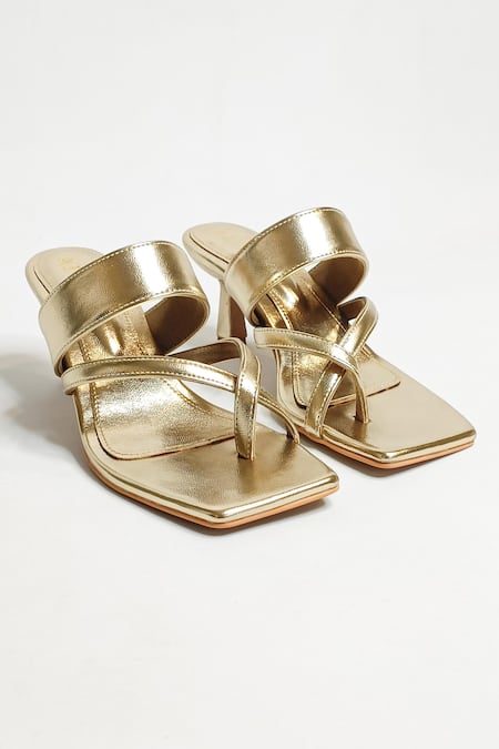 Square toe design for added comfort, Cross strap detailing for secure fit, Shiny metallic finish for a glamorous look