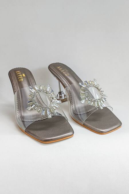 Grey Rhinestones Estella Transparent Strap Embellished Pyramid Heels