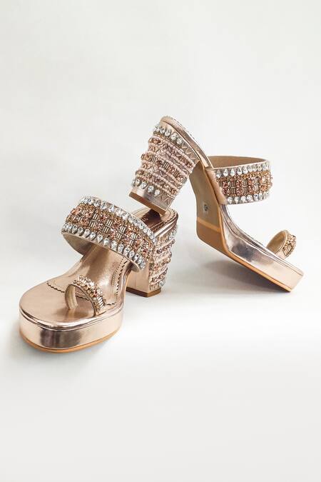Gold and pink faux leather heels featuring a rounded front cut and rhinestones embellishment