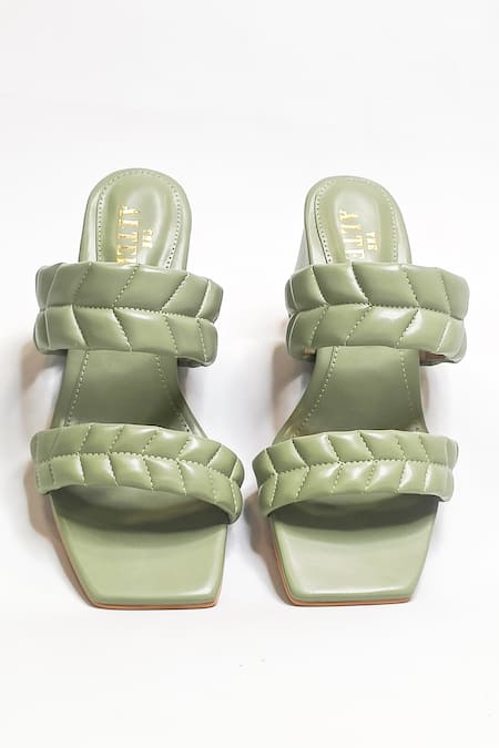 Mint green block heels featuring a quilted pattern on two straps and square toe detailing