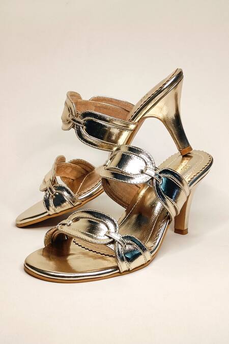 Gold stiletto heels featuring double ring straps and a cushioned insole