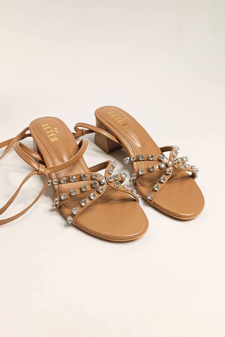 Beige block heels featuring rhinestone embellishments and tie-up straps