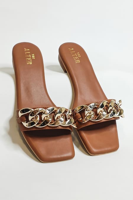 Brown vegan faux leather flats featuring a t-shaped design with a chain detail on the strap