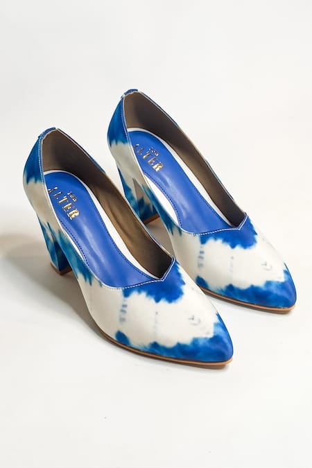 Blue and white vegan faux leather pumps featuring a tie-dye print