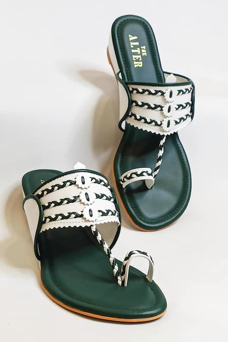 Bottle green two-tone wedges featuring braided straps and a toe ring design