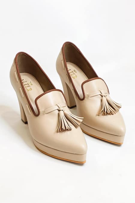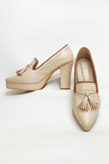 Beige vegan faux leather pointed style oxford block heels featuring fringed tassel embellishment