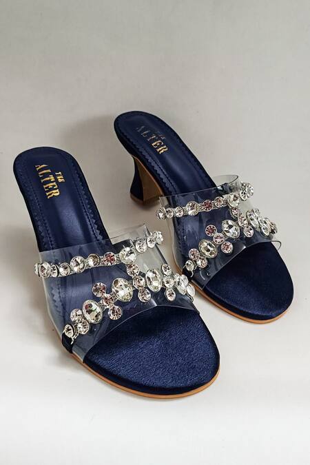 Blue hourglass heels featuring rhinestone embellishments on the strap and a round open toe design