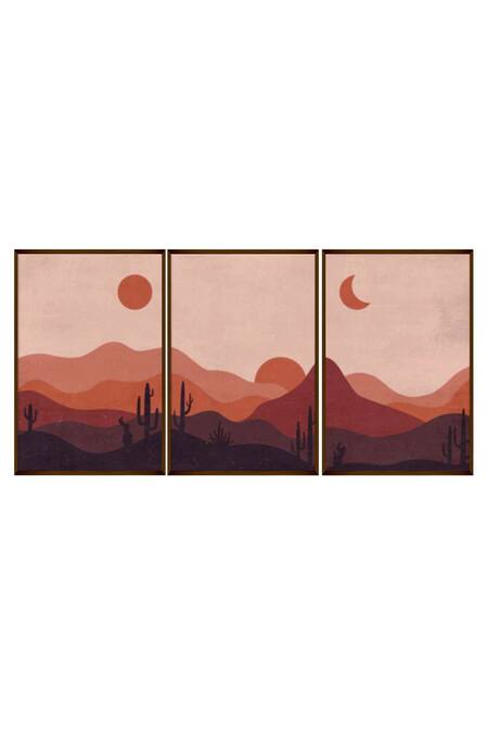 Multi Color Canvas Digital Print Sun And Moon Desert Painting Set Of 3