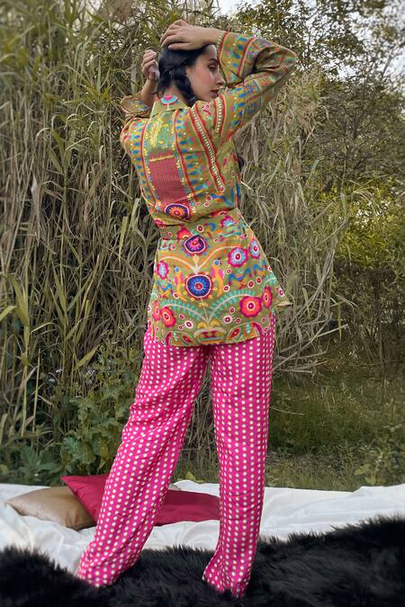 Multi color Moroccan silk wrap top featuring all over floral doodle print, flared sleeves, and notched lapel collar. Paired with wide-legged pants adorned with polka dot print and a tie-up belt.