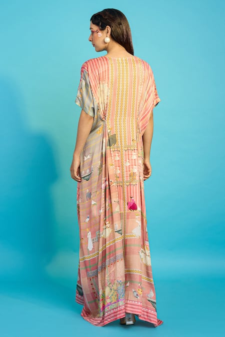 Pink Silk V-neck Mughal Palace Print Kaftan