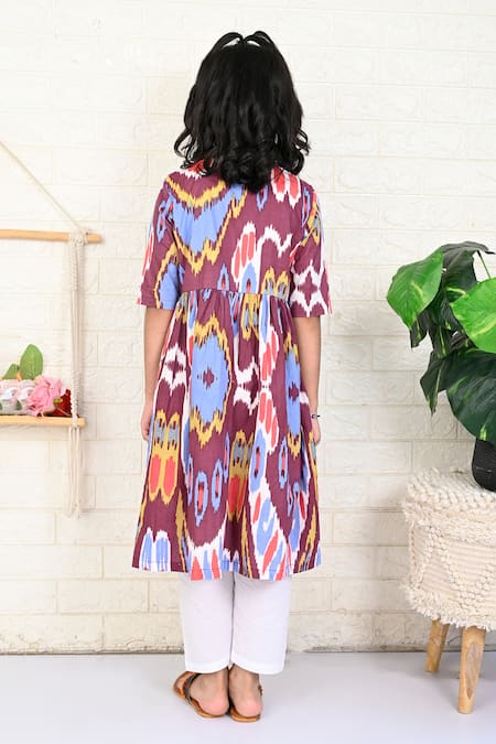 Magenta kurta featuring ikat print all over with front opening. Paired with a solid white straight pant.