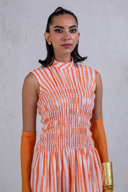 Orange Art Twill Printed Striped High Collar Bloombells Smocked Dress
