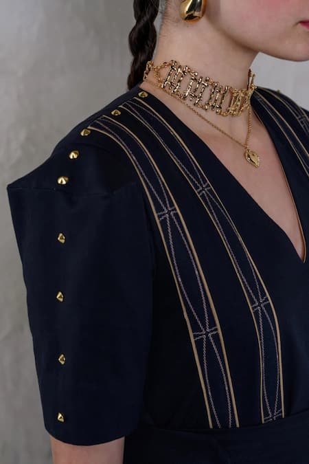 Cut & sew panel detailing, Studs work on shoulder and sleeves, Attached lining