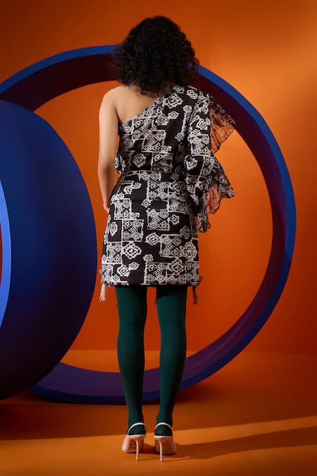 Black one shoulder top featuring clematis print and ruffle detailing on sleeves. Paired with a skirt showcasing hand embroidery on the hem and side pockets.