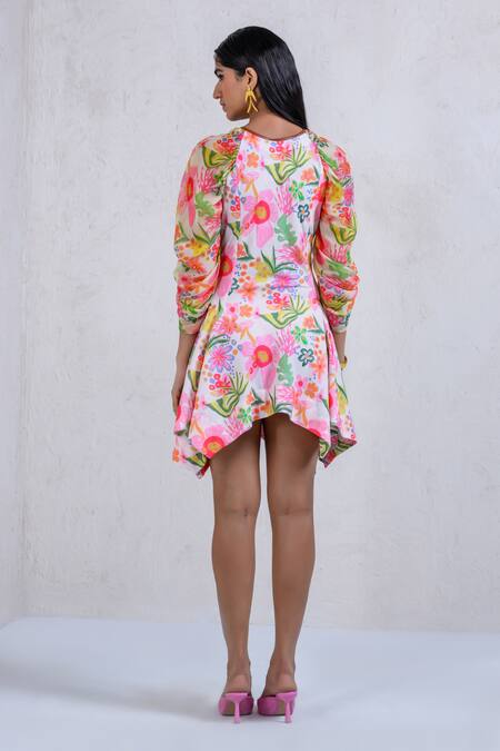 White Art Twill Printed Floral Round Galentines Godet Dress