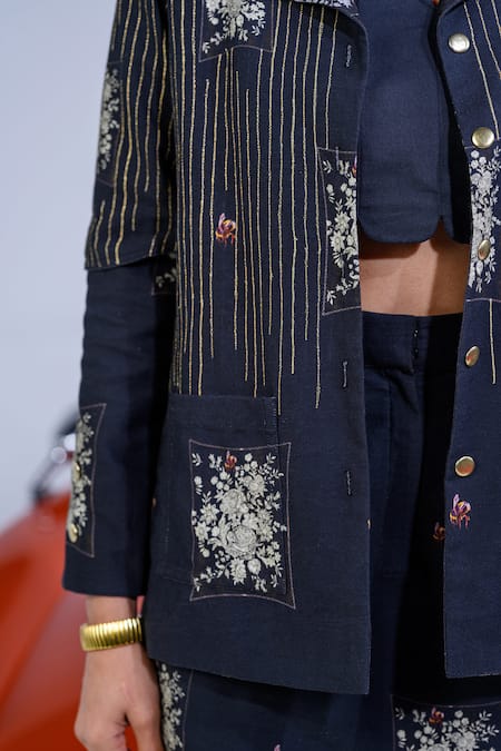 Black blazer featuring gold zari thread embroidery in stripe pattern and floral print. Paired with a scallop bordered bustier and a matching skirt.