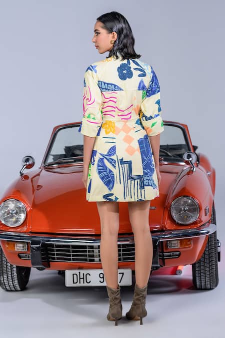 Yellow Cotton Denim Twill Printed Abstract Collar Olva Dress