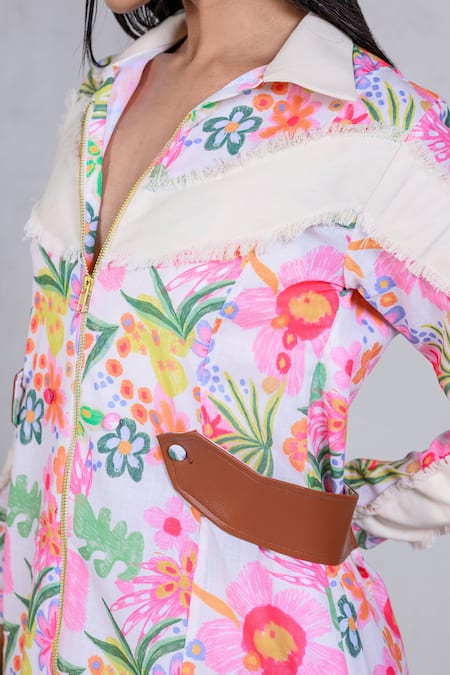 White Art Twill Print Floral Stand Collar Petunia Power Dress